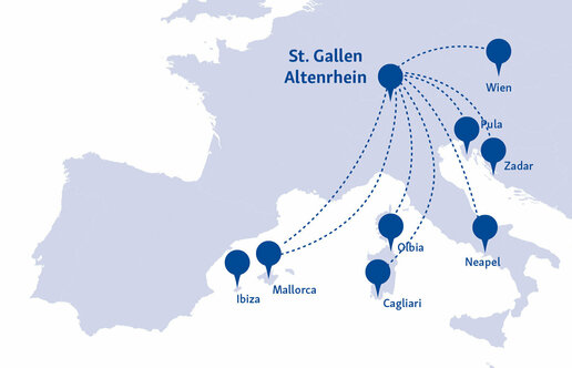 Wir fliegen für Sie mit People’s sowie neu mit Private Wings in die Traumdestinationen SardinienIbizaMallorcaIstrien, Brac und Elba – perfekt für Ihre Badeferien. In der Vor- und Nachsaison bieten wir Ihnen ausserdem Sonderflüge mit unseren beliebten Erlebnisreisen nach Neapel an. Ganzjährig wird für Städtetrips die Strecke Altenrhein Wien geflogen.