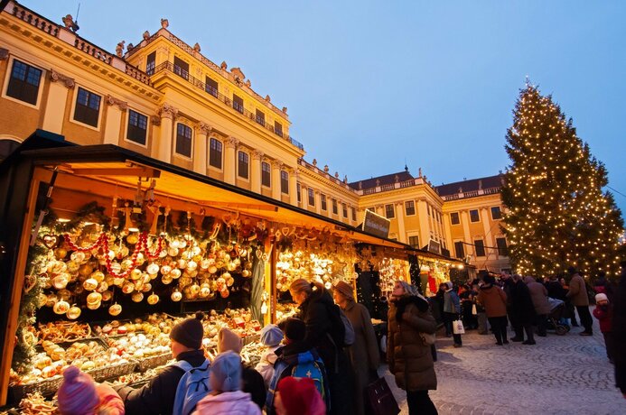 Weihnachtsmarkt Schloss Schönbrunn: Das imposante Schloss Schönbrunn bietet die perfekte Bühne für den Weihnachtsmarkt mit zahlreichen, in Gassen angelegten Ständen. Traditionelles Kunsthandwerk und liebevolle Weihnachtsdekorationen bis hin zu Spielwaren zählen zum exklusiven Sortiment. Süße, pikante und deftige Versuchungen warten an jeder Ecke und verzaubern mit ihren verlockenden Aromen den riesigen Platz vor dem Schloss.