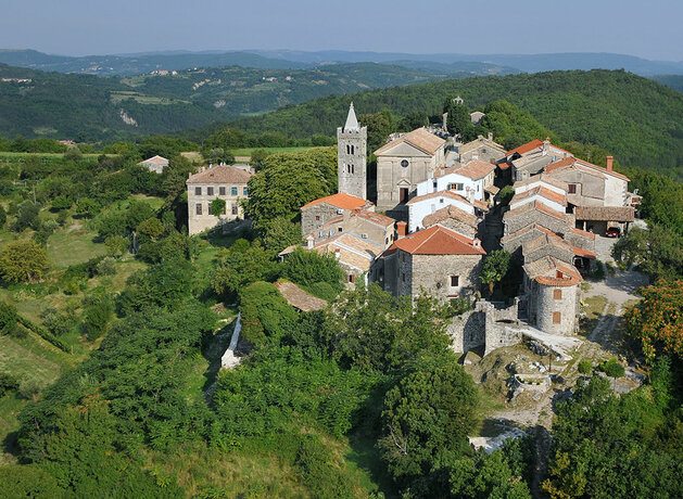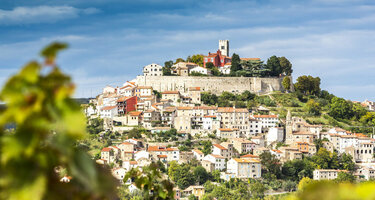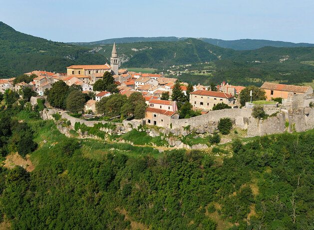 Motovun, das Burgstädtchen thront über Weingärten und Trüffelwälder des Mirnatales umgeben von einer wehrhaften Doppelmauer, die begehbar ist. Der allgegenwärtige Markuslöwe erinnert an venezianische Zeiten, ebenso die Kirche des hl. Stefan, die im 16. Jh. vom legendären Renaissancebaumeister Andrea Palladio errichtet wurde. In die autofreie Altstadt gelangt man mit Bus-Shuttles oder zu Fuß.