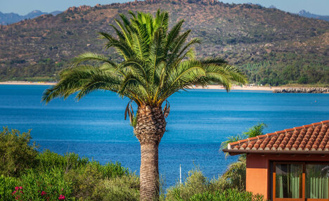 Das Hotel liegt direkt am Sandstrand in der Bucht vonSan Gemiliano.