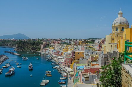 Ein besonderes Highlight Ihrer Reise ist der inkludierte Tagesausflug auf die kleine Schwesterinsel Procida. Nach der Überfahrt mit dem Schiff entdecken Sie die farbenfrohe Insel bei einer Rundfahrt. Immer wieder laden Fotostopps dazu ein, die pastellfarbenen Fischerhäuser, die lebendigen Häfen und die traumhafte Küstenlandschaft festzuhalten. Besonders eindrucksvoll ist der Halt in Terra Murata, dem höchstgelegenen Punkt der Insel: Von hier aus eröffnet sich ein spektakulärer Blick über die bunten Häuser von Marina Corricella und das tiefblaue Meer. Procida – Kulturhauptstadt 2022 – verzaubert mit mediterranem Charme, Authentizität und einer Atmosphäre, die noch das ursprüngliche Italien spüren lässt. Am späten Nachmittag Rückfahrt mit dem Schiff nach Ischia.