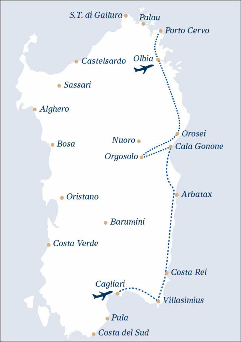 Startpunkt Ihrer Reise ist Olbia, das Tor zur weltberühmten Costa Smeralda. Entdecken Sie exklusive Orte wie Porto Cervo oder Baia Sardinia, bummeln Sie entlang eleganter Promenaden und genießen Sie das smaragdgrüne Meer in versteckten Buchten zwischen Granitfelsen. Auch das Hinterland hat viel zu bieten: geheimnisvolle Nuraghen, Gigantengräber und traditionsreiche Dörfer prägen das Landschaftsbild.