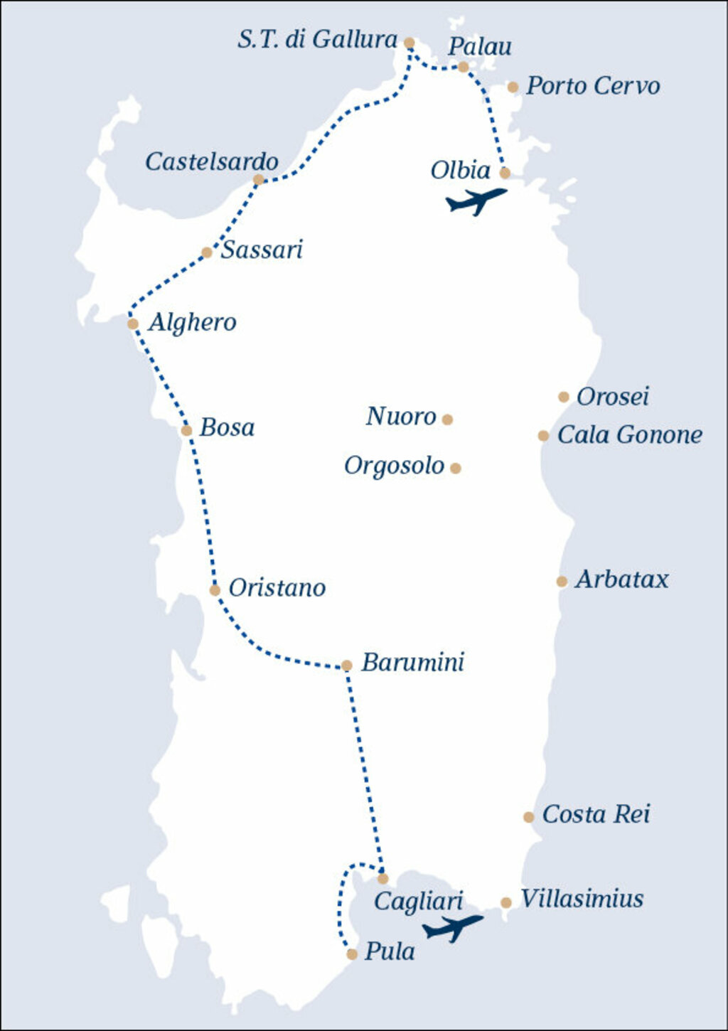 Die Rundreise beginnt im Norden, in der Region rund um Olbia. Hier erwarten Sie traumhafte Buchten, smaragdgrünes Meer und mondäne Orte wie Porto Cervo mit seinem berühmten Yachthafen. Unternehmen Sie einen Ausflug auf die Insel La Maddalena, wandern Sie zum Capo d’Orso oder entdecken Sie faszinierende prähistorische Stätten wie Nuraghen und Gigantengräber. Das hügelige Hinterland mit Korkeichenwäldern und Granitformationen bietet authentisches Sardinien abseits der Küstenstraße.