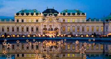 Das Schloss Belvedere, zu ehren von Prinz Eugen von Savoyen im 18. Jahrhundert erbaut, befindet sich in einem aufstrebenden Stadtteil von Wien, nahe des neuen Hauptbahnhofes. Das obere und untere Belvedere, benannt aufgrund der Lage auf einem südlich der damaligen Stadt ansteigenden Hang, bilden mit der verbindenden Gartenanlage ein barockes Ensemble. Heute befinden sich hauptsächlich wertvolle Gemälde der Galerie Belvedere in den altehrwürdigen Bauwerken des Stadtpalais. Vor dem Schloss befindet sich in der Vorweihnachtszeit ein kleiner, beschaulicher Weihnachtsmarkt mit einer handvoll Marktbuden, die Kunsthandwerk, handgemachte Weihnachtsdekoration und kuschlig warme Winteraccessoires anbieten. Probieren Sie den heißen Glühwein mit bestem steirischen oder niederösterreichischen Wein oder heißen Beerenpunsch, der in den traditionellen blauen Christkindlmarkthäferln ausgeschenkt wird.