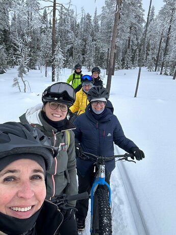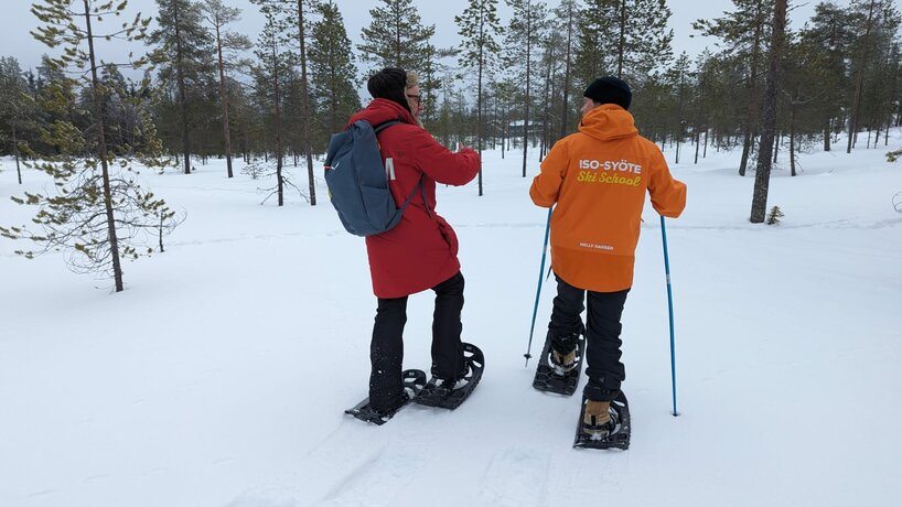 Es gab einen kurzen Stopp um sich mit einem Getränk aufzuwärmen und die Fahrt ging unter der Leitung von einem lokalen Guide weiter. Ein Besuch auf der Rentierfarm von Mika und seiner Familie stand ebenfalls auf dem Programm, und wir erhielten dort wertvolle Einblicke in das Leben auf einer Rentierfarm in Finnland. Bei einigen schmückt nun ein Rentierfell so manchen Outdoorbereich. Auch die Schneeschuhtour war für viele ein besonderes Erlebnis, da unser Guide, während wir duch den Schnee stapften, allerlei Wissenswertes über die Flora und Fauna im Nationalpark bzw. in Finnland im Allgemeinen erzählte.